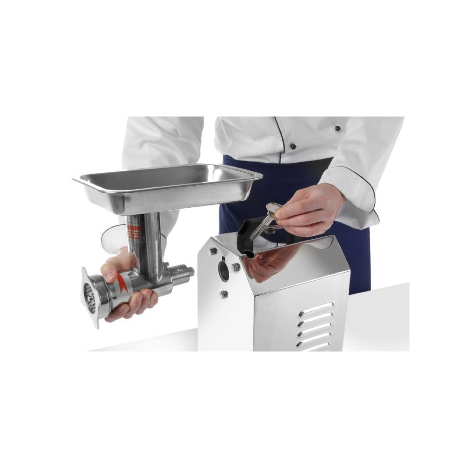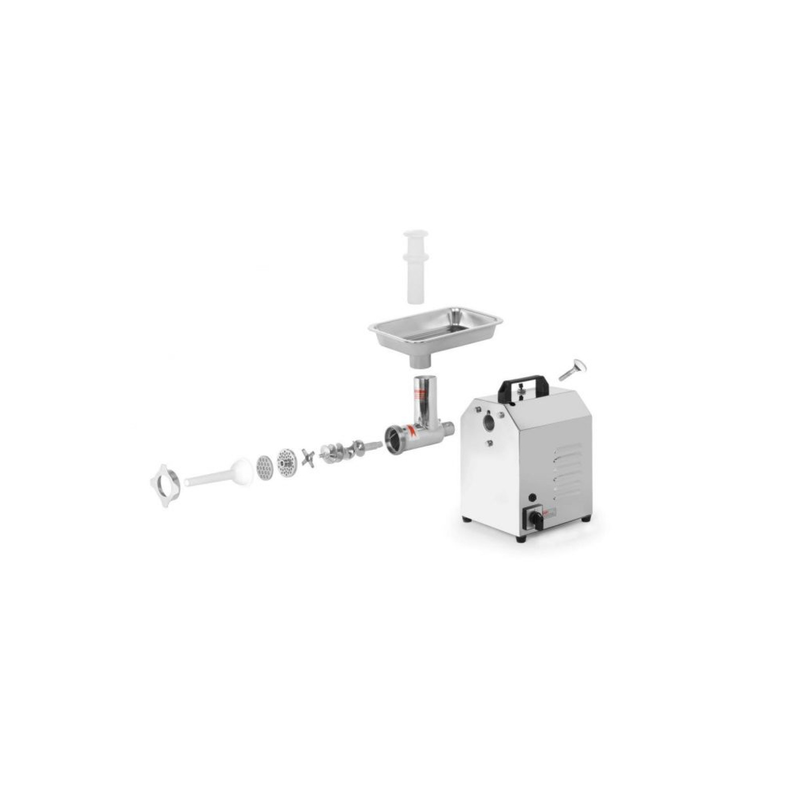 Високоякісний професійний пристрій для подрібнення всіх видів м'яса без кісток та шкіри – Корпус повністю виконаний із високоякісної полірованої нержавіючої сталі. Знімний корпус робочого елемента з хірургічної сталі 304 18/10 – Простий демонтаж корпусу робочого елемента, а також всіх внутрішніх компонентів – полегшує чищення пристрою із запобіжником від перегріву – Швидкість обертання 165 об/хв. – Пристрій оснащений функцією реверсу (зворотного ходу) у разі необхідності очищення шнека – Кнопка скидання захищає від навантаження – Контейнер для м'яса з нержавіючої сталі – Клас захисту IPX1 – Зручна ручка на корпусі для перенесення – Нековзні ніжки – Комплектація: – грати з не діаметром отворів 6 мм – грати з нержавіючої сталі з діаметром отворів 8 мм – 1 ніж з нержавіючої сталі – 1 шнек із нержавіючої сталі – Насадка для ковбаси з поліпропілену – Точка з поліетилену – Не призначена для безперервної роботи (після 45 хв. роботи вимкнути пристрій та дати охолонути)