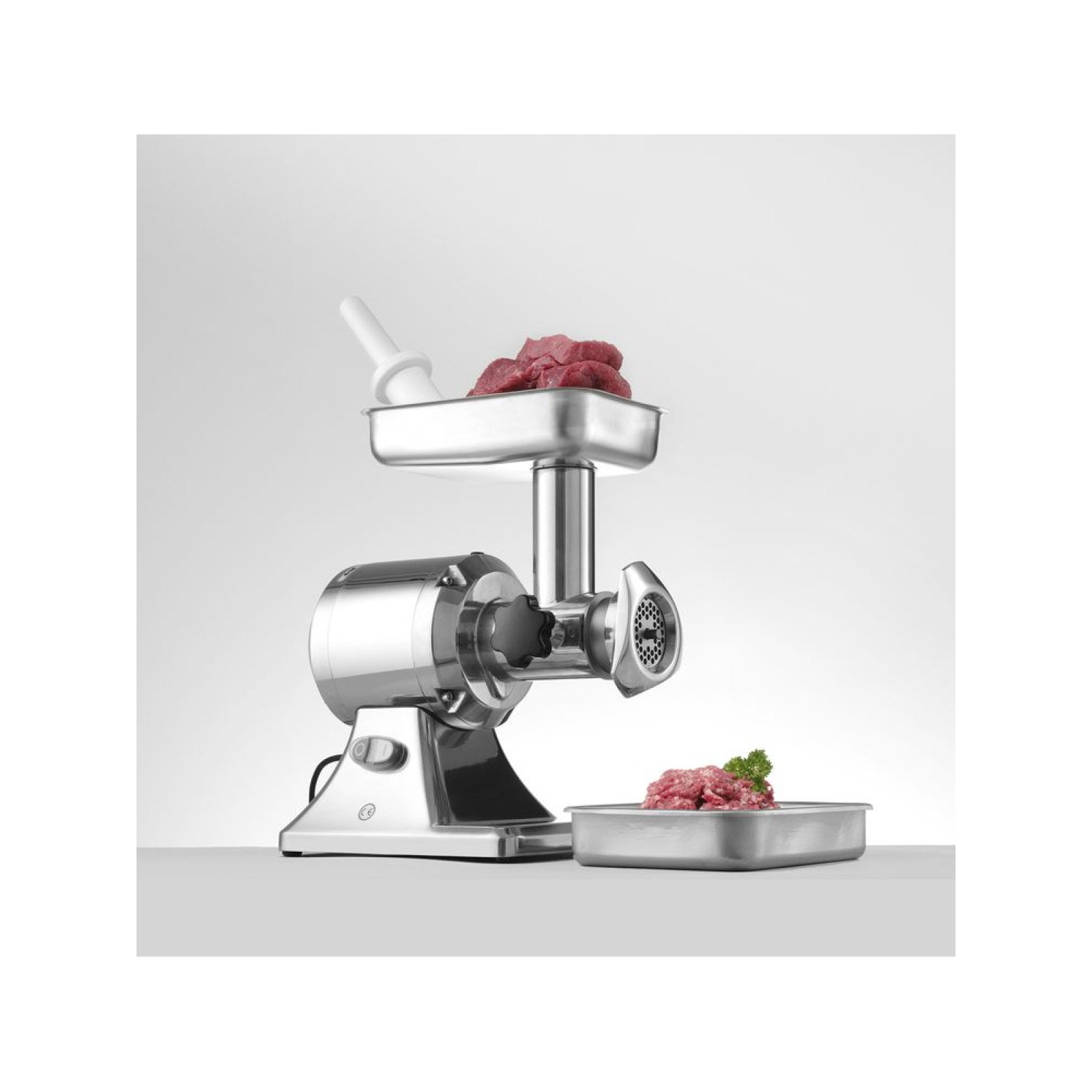 М'ясорубка HENDI Profi Line 12, шнек із нержавіючої сталі - код 282200 Особливості продукту: Корпус із нержавіючої сталі, завантажувальний бункер та контейнер для м'яса Натискний штифт із поліетилену Сітчастий фільтр ø70 мм із отворами ø6 мм із нержавіючої сталі Нековзкі ніжки Вага: 19 кг. Тимчасова продуктивність: 200 кг/год Не призначено для безперервної роботи.