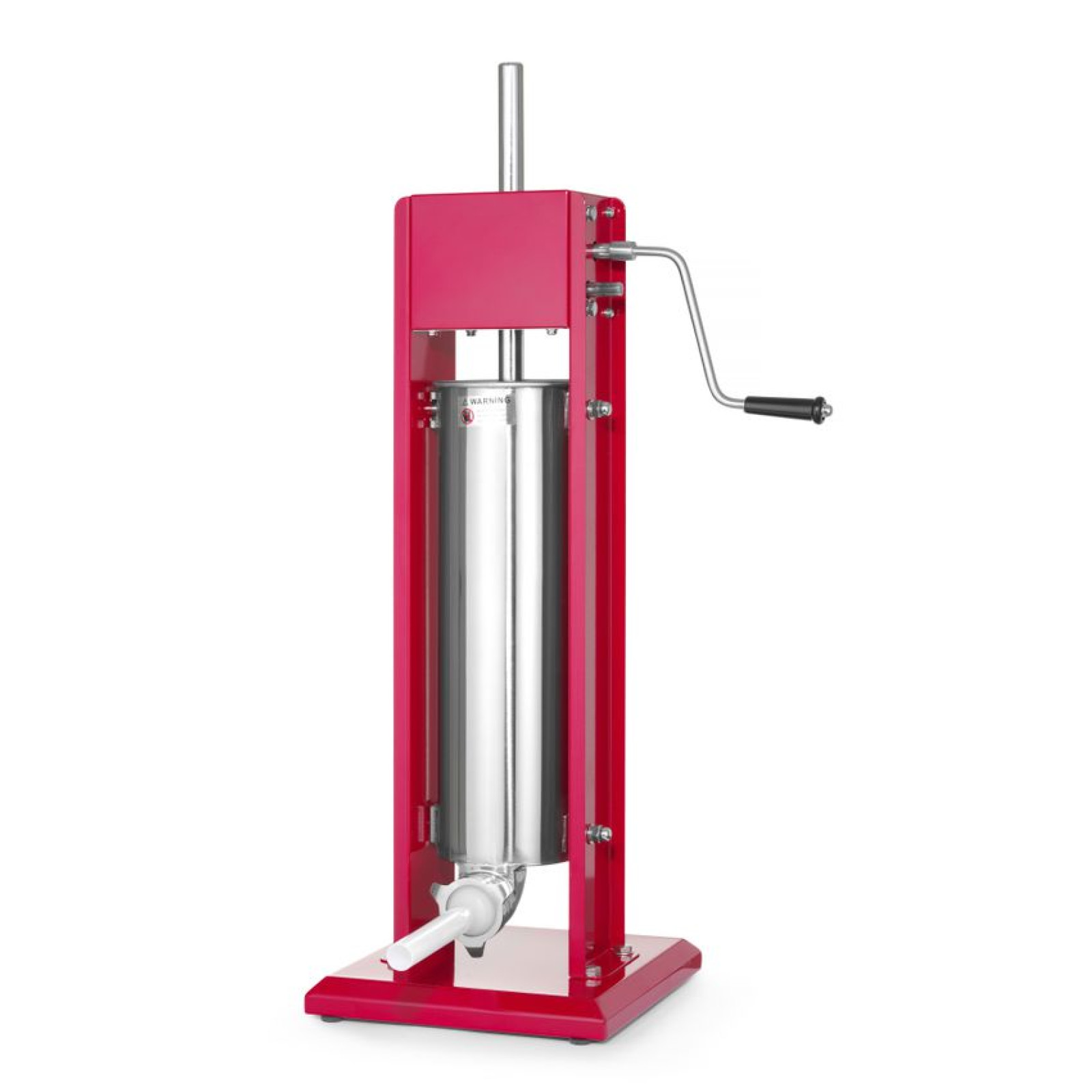 Пристрій високого класу, рекомендований для професійного використання: на невеликих підприємствах, підприємствах громадського харчування, ресторанах, фермерських господарствах чи коптильнях. Завдяки простоті експлуатації та зручності використання він також добре працює в домашніх умовах. Високоякісні матеріали та висока якість виготовлення гарантують його довговічність. Пристрій призначений для використання правшами, так і лівшами. Особливості продукту: • простота та рівномірність дозування забезпечують ідеальну форму продукту, • циліндр та поршень з нержавіючої сталі, повністю стійкі до корозії, • естетичний корпус із сталі, пофарбованої в червоний колір, • редуктор із двома швидкостями наповнення дозволяє налаштувати роботу пристрою під потреби користувача, • легке розбирання приводу та рухомого шпинделя, дає можливість простого заправлення та очищення машини, • несуча та зубчаста система із загартованої сталі забезпечує стійкість механізму до тиску, • набір аксесуарів містить 4 пластикові вирви різних діам