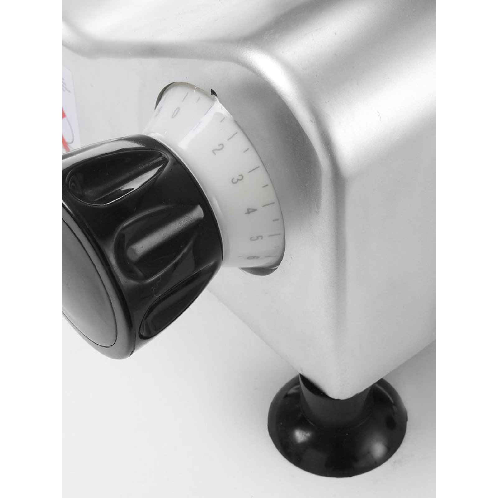 СЛАЙСЕР HENDI PROFI LINE 300Виготовлений з анодованого алюмінію, з антиковзними ніжками. Лезо із загартованої неіржавної сталі, встановлене під кутом. Двигун з повітряним охолодженням із запобіжником від перегріву. Потужний двигун для різання твердого м'яса Захисний кожух для леза, вбудоване точило. Каретка із захисним екраном, затискним елементом і фіксацією у вертикальному положенні. Швидко та легко розбирається для чищення. Відповідає всім вимогам безпеки пристроїв для професійного використання, таким як:- тримання леза за захисним екраном при встановленні товщини зрізу 0 ;- захист від пуску під час зняття точила або кожуха леза;-каретку можна зафіксувати та перемістити, лише коли регулятор товщини встановлений в позиції 0 ;-не призначений для різання сиру. Нарізання сиру можливе лише за допомогою ножа з антипригарним покриттям. Ніж продається окремо.- Діаметр ножа: 300 мм.- Плавне регулювання товщини скибочки від 0 мм до 15 мм.- Максимальний діаметр продукту до нарізання 200 мм.