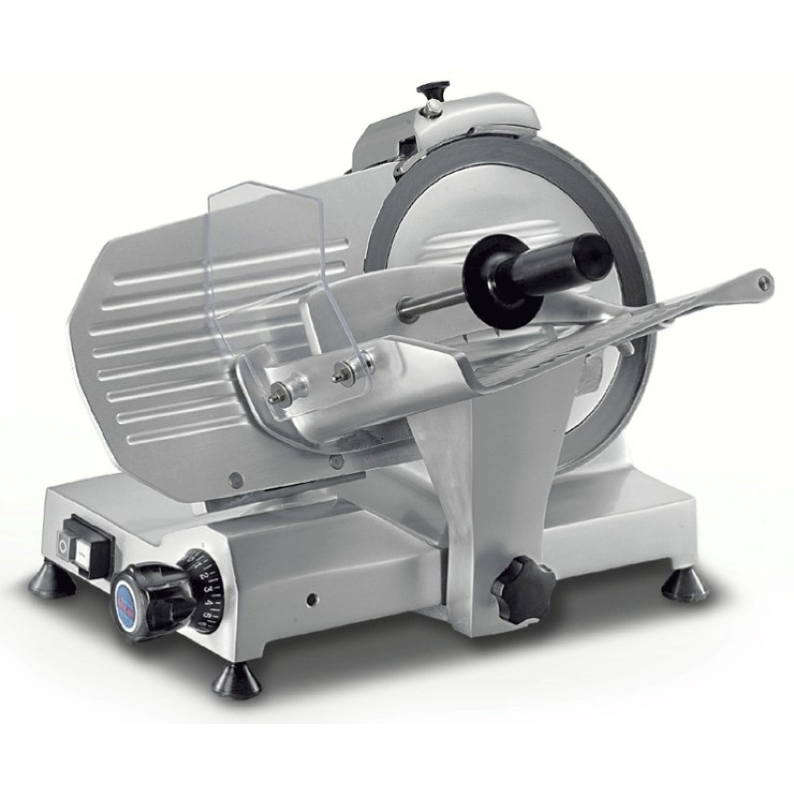 Напівавтоматичний з ручною подачею. Корпус – литий анодований алюміній. Ніж – хромована сталь. Вбудований механізм для заточування ножа. Діаметр ножа 220 мм, товщина нарізки до 13 мм. Хід каретки 245 мм. Розмір лотка 230х240 мм.