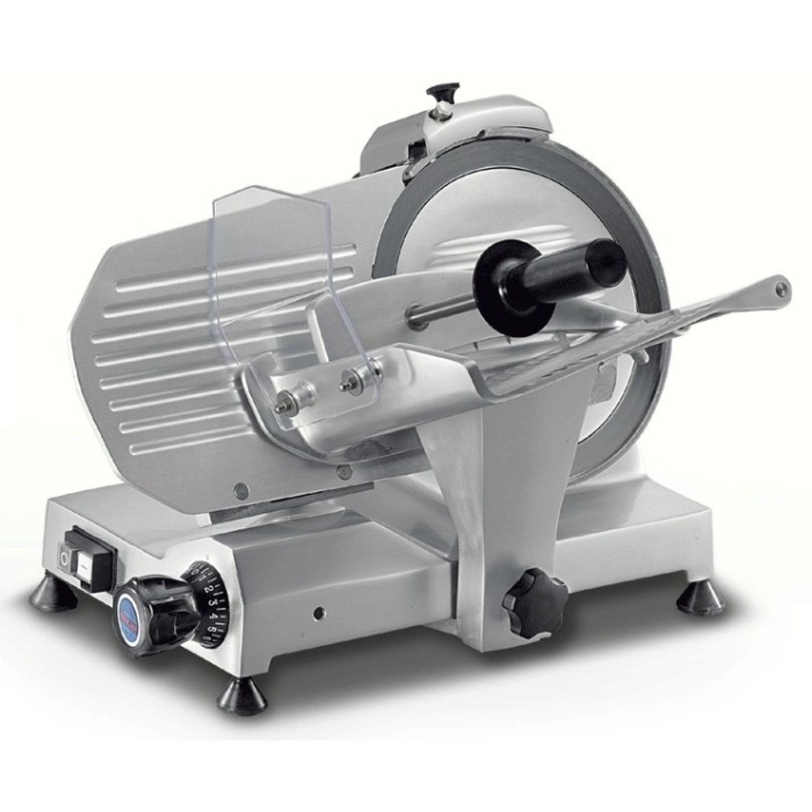 Діаметр ножа 275 мм. Ніж – хромована сталь. Корпус – литий анодований алюміній. Механізм для заточування ножа. Товщина нарізки 13 мм. Лоток 230x240 мм. Хід каретки 245 мм. Розблокування на каретці.