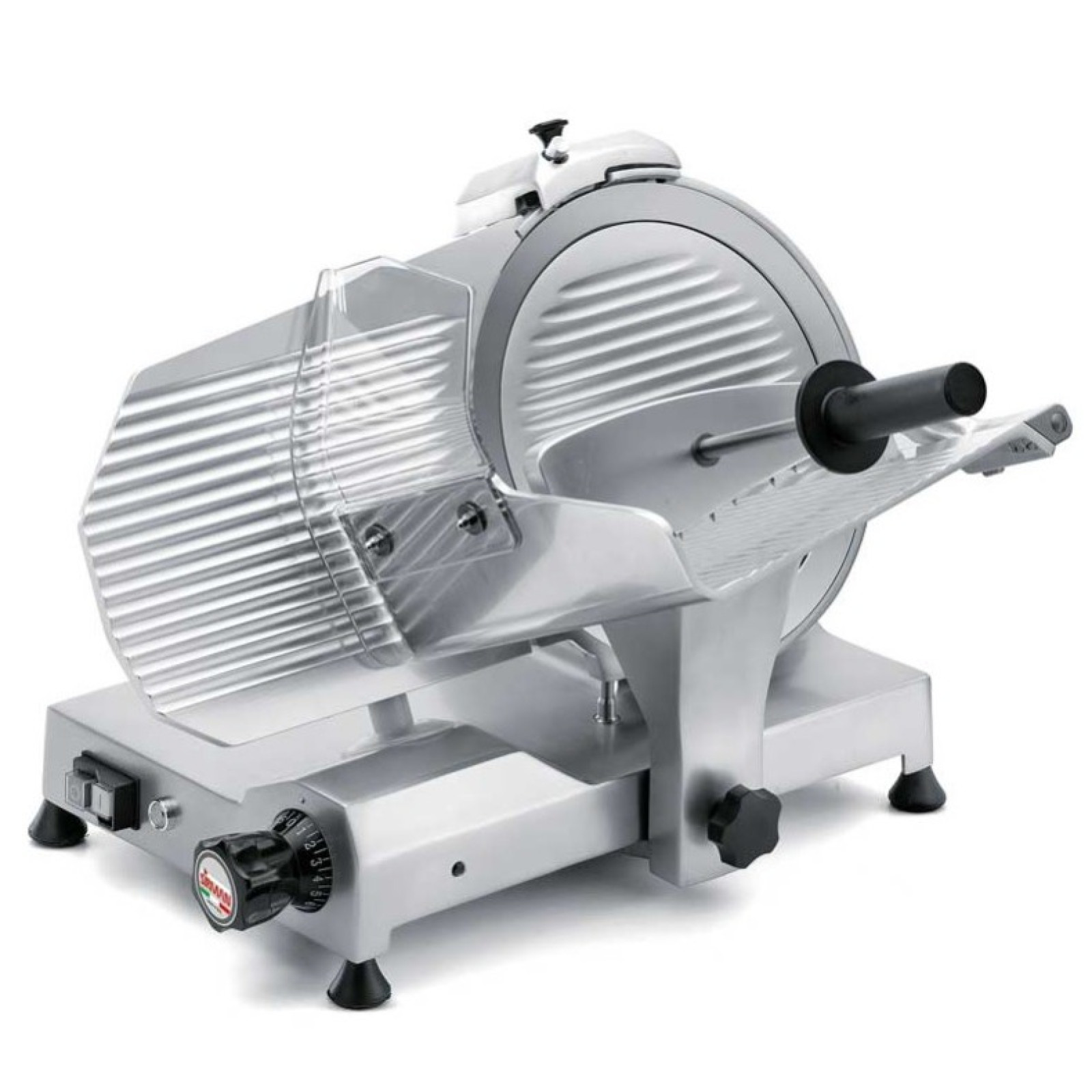 Діаметр ножа 300 мм. Ніж – хромована сталь. Корпус – литий анодований алюміній. Механізм для заточування ножа. Товщина нарізки 13 мм. Лоток 250x275 мм. Хід каретки 285 мм.