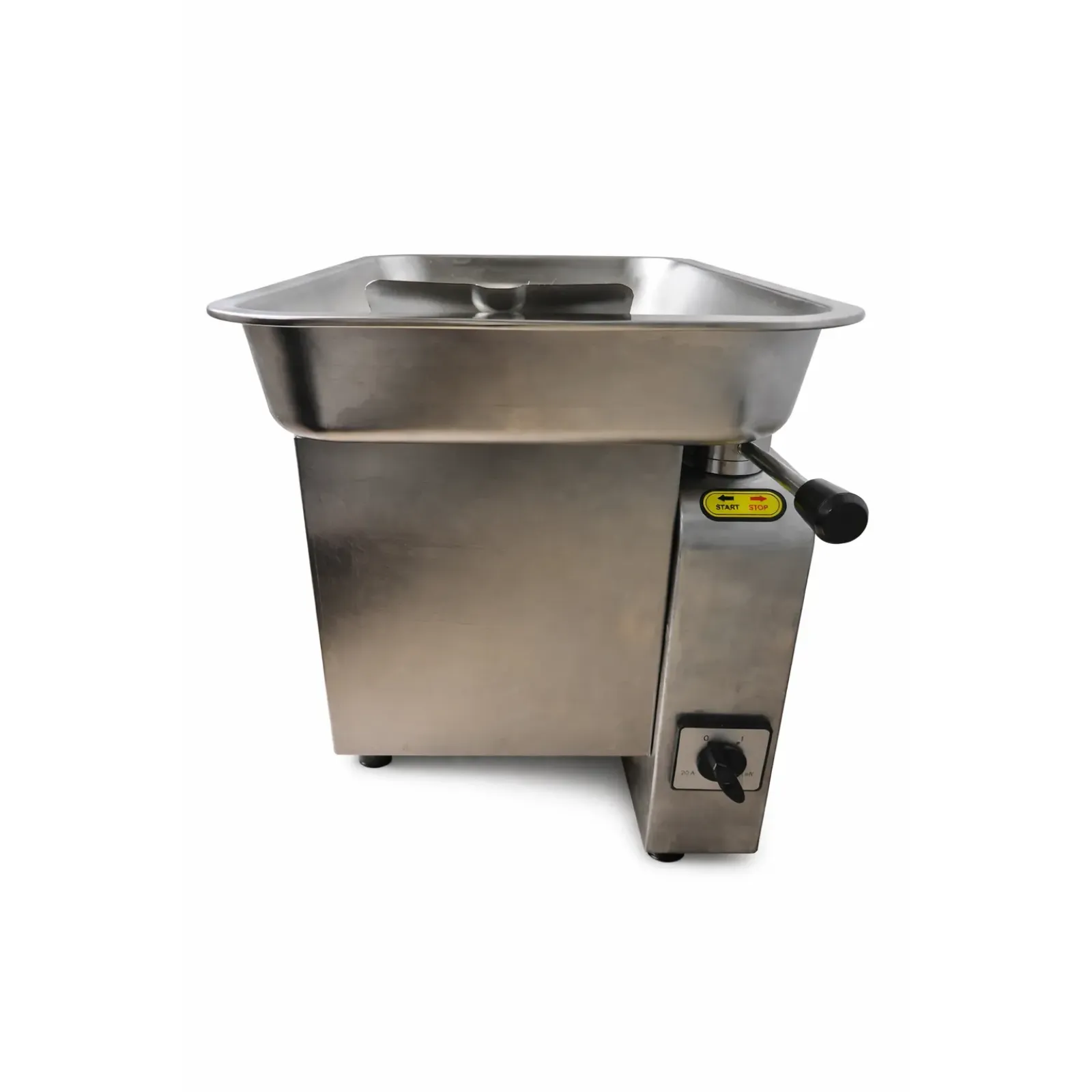 Невелика настільна машина для овочевих, заготівельних, кулінарних та м'ясо ковбасних цехів, призначена для виробництва фаршу та нарізання м'яса, оливних вух, джерок, овочів на смужки та сала на шпиг