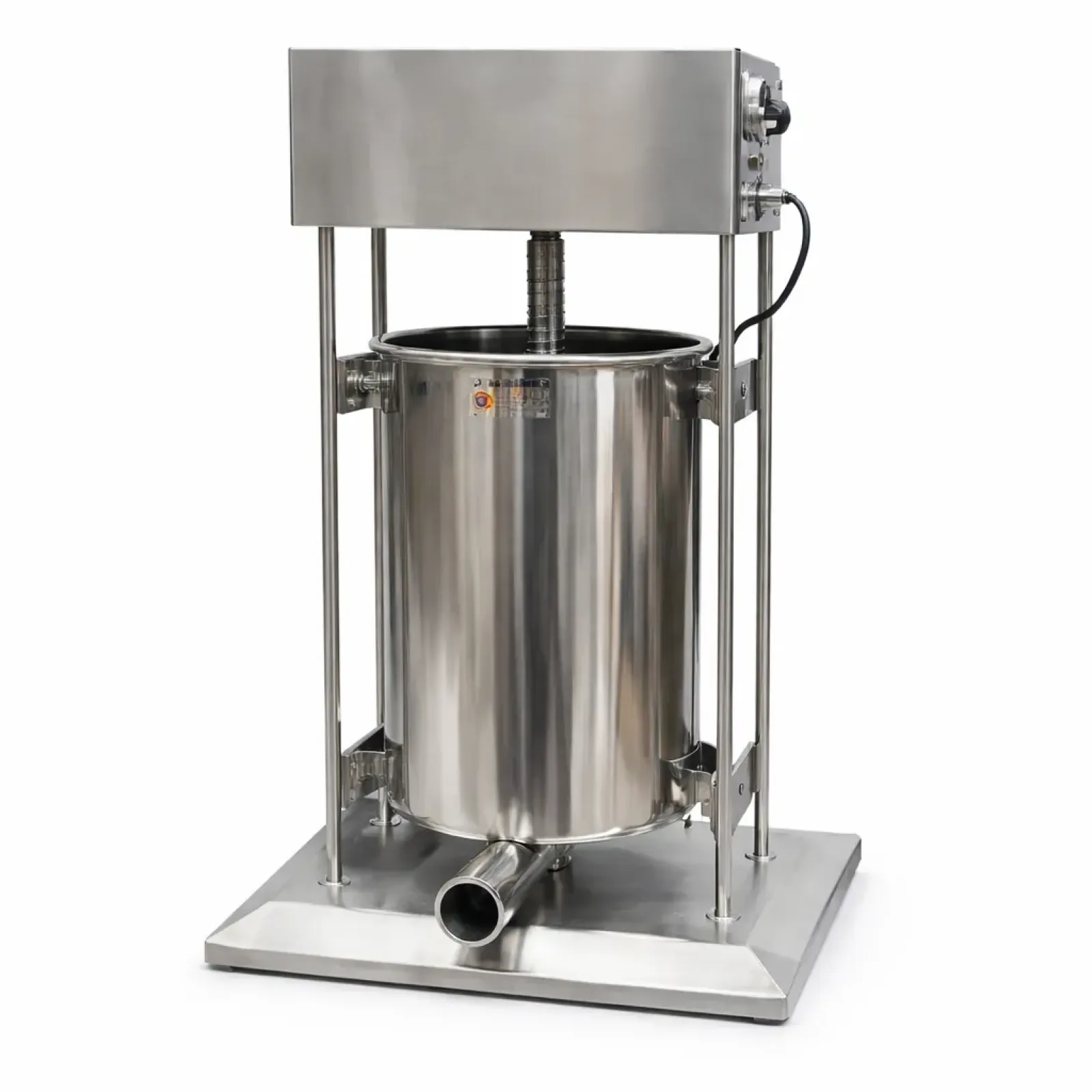 Електричний вертикальний шприц для наповнення ковбас об'ємом 15 літрів, виготовлений повністю з нержавіючої сталі. У комплекті 4 різні насадки з нержавіючої сталі.