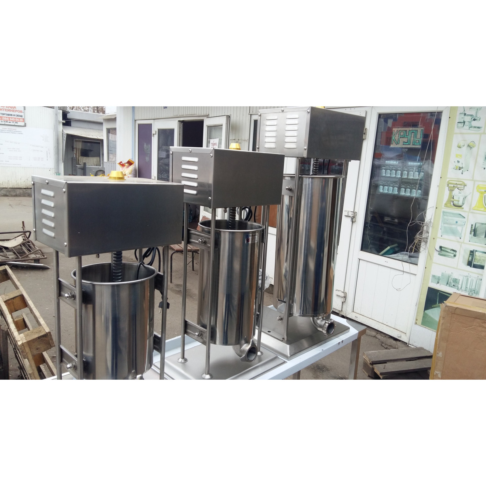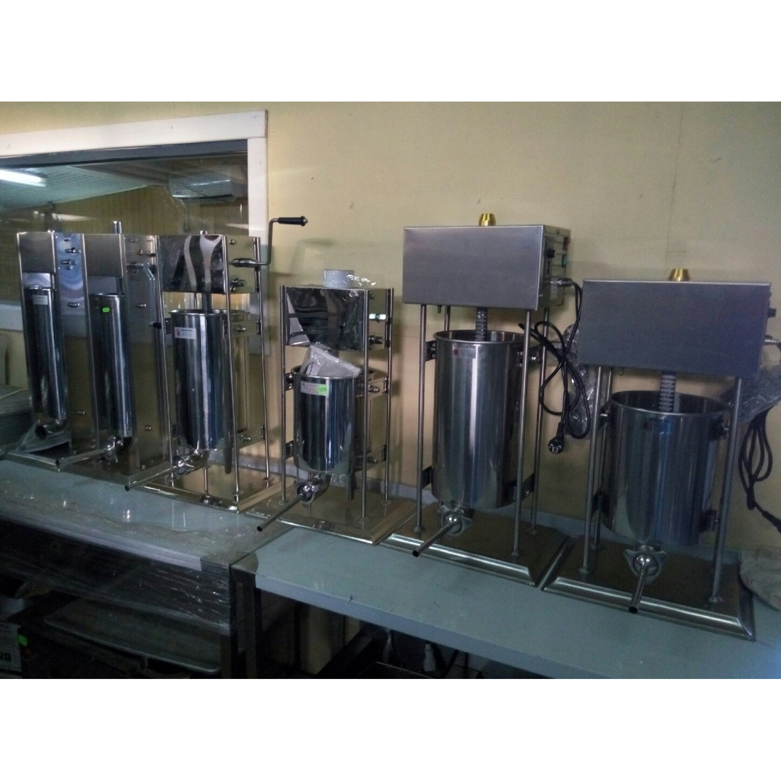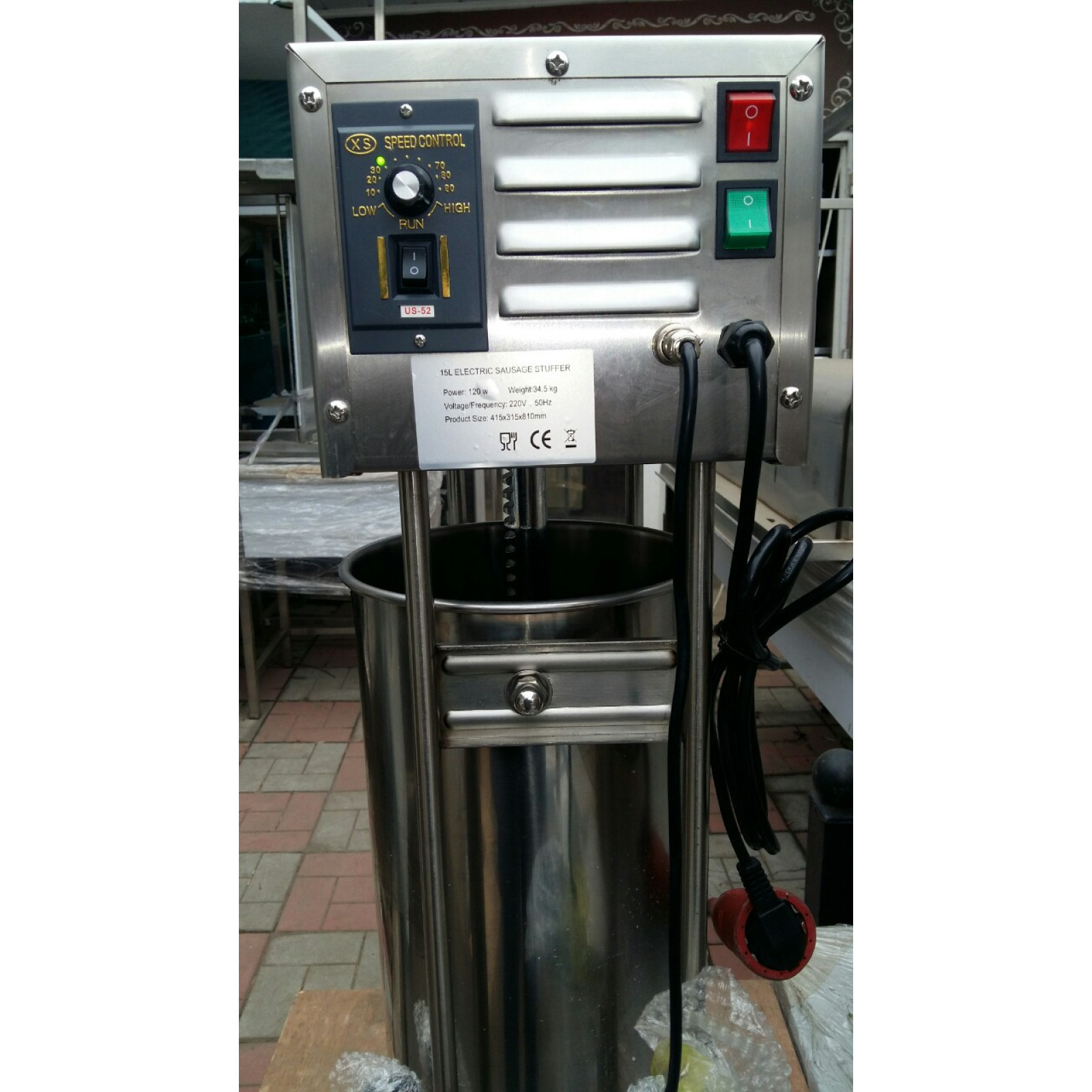 Шприц для наполнения колбасы электрический вертикальный, объёмом 15 литров изготовлен полностью из нержавеющей стали. В комплекте с 4 различными насадками из нержавеющей стали.