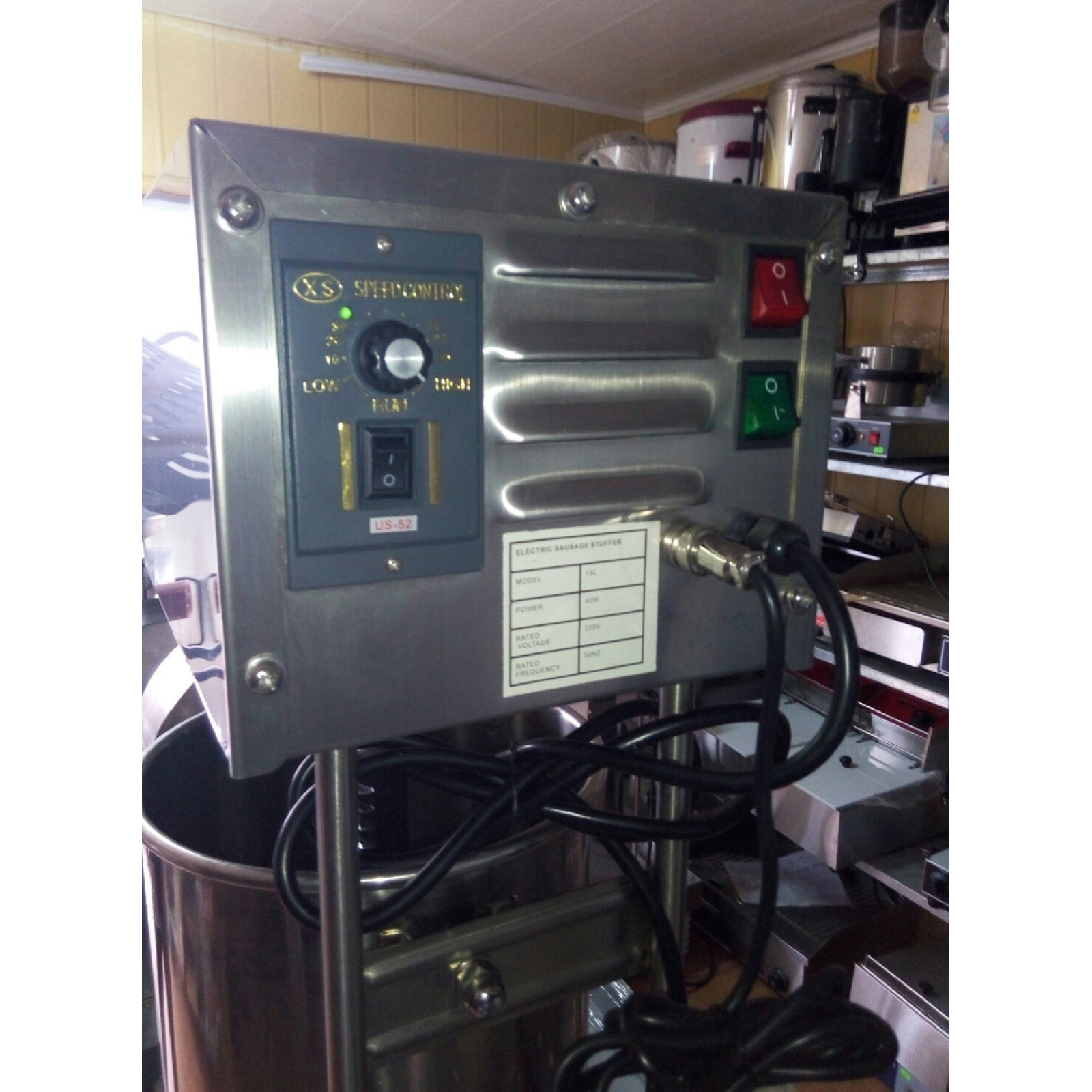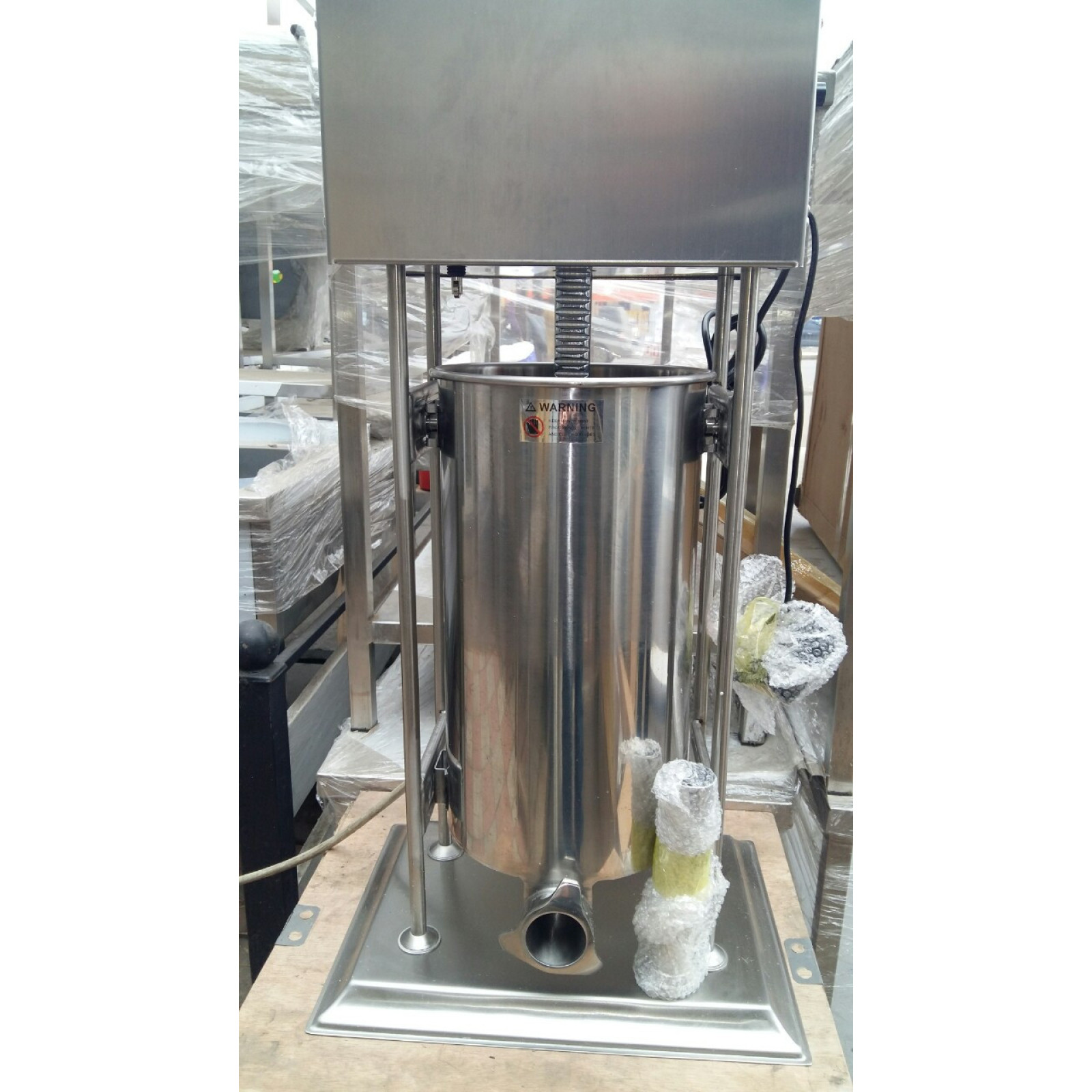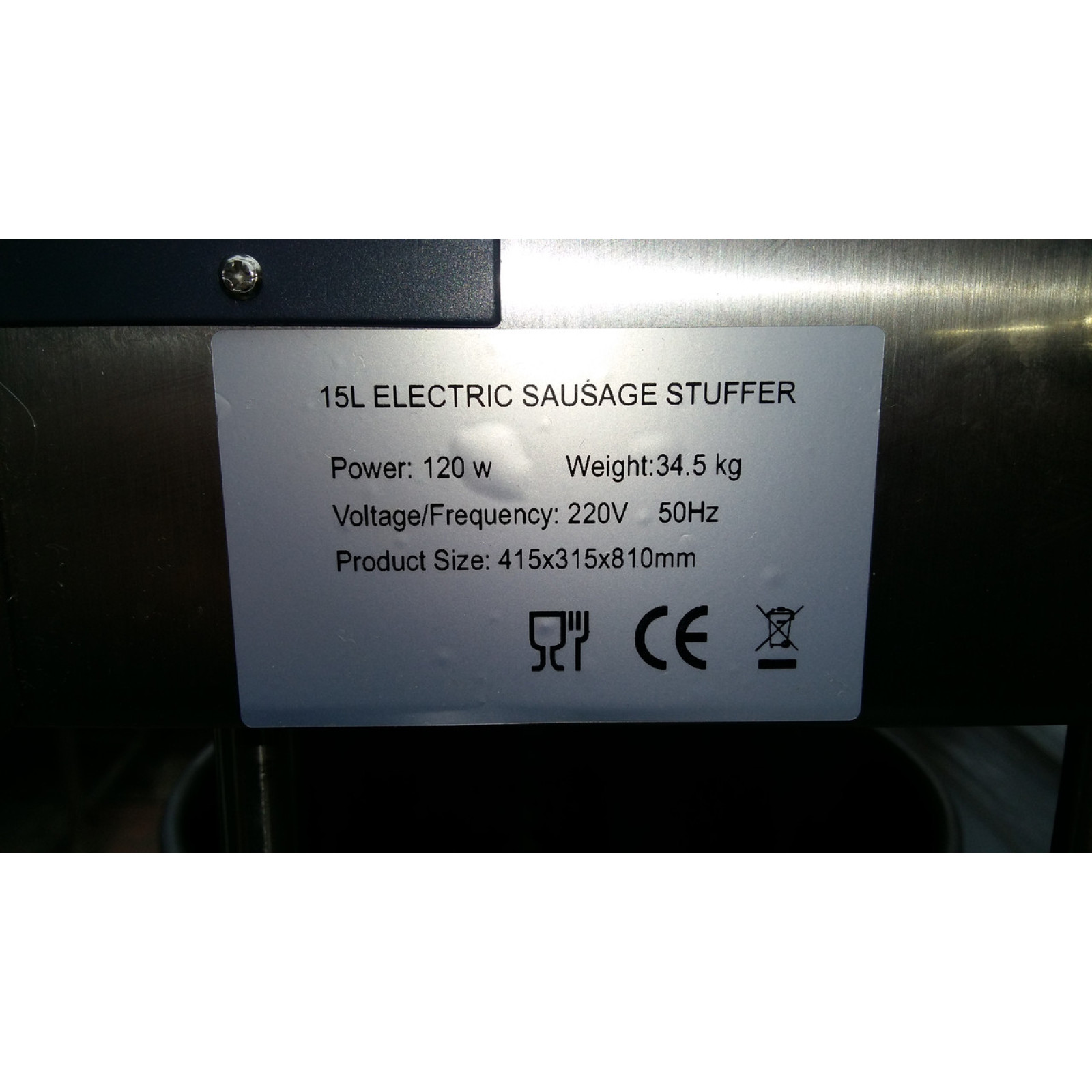 Шприц для наполнения колбасы электрический вертикальный, объёмом 15 литров изготовлен полностью из нержавеющей стали. В комплекте с 4 различными насадками из нержавеющей стали.