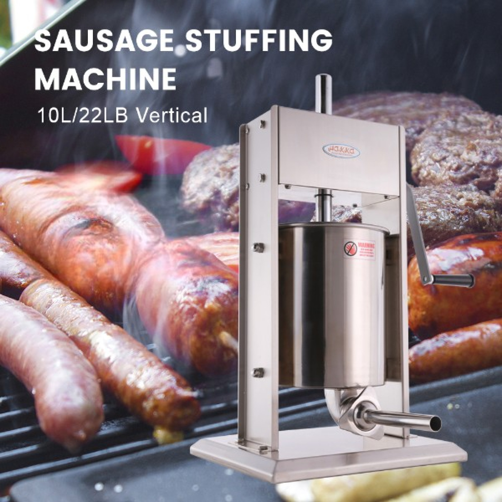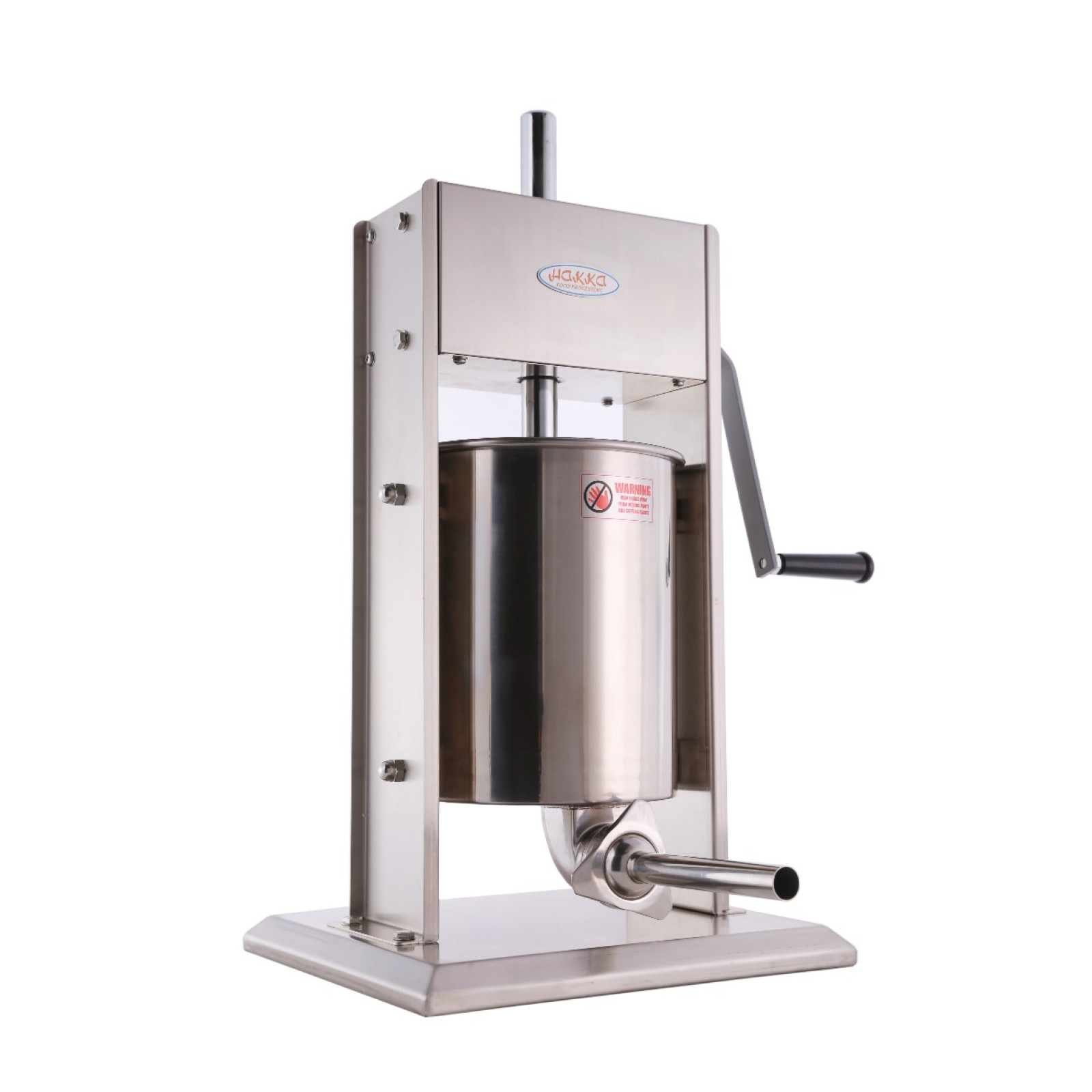 Міцна конструкція з бічними стінками з нержавіючої сталі типу 201 і знімною відкидною каністрою з нержавіючої сталі типу 304. Начинка для ковбас з нержавіючої сталі Hakka ємністю 22 фунта/10 л з нержавіючої сталі типу 304. за межами каністри. Це забезпечує тривалий термін служби, а також швидке та просте очищення. Тяжка основа та великі гумові ніжки також забезпечують стійкість під час використання.