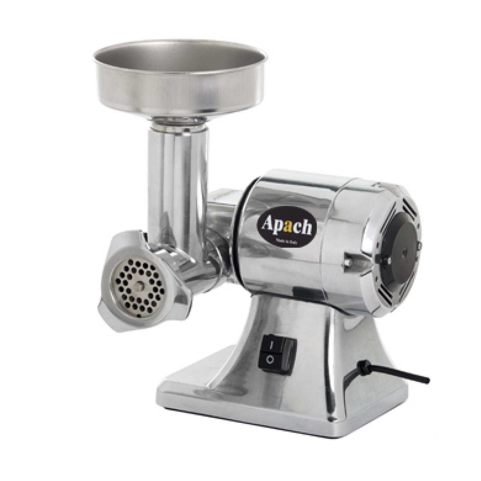 М'ясорубка Apach оснащена вентильованим асинхронним двигуном із захистом від перевантажень. Лоток та горловина м'ясорубки виконана з нержавіючої сталі. М'ясорубкова частина - харчовий чавун. Насадка та ніж з нержавіючої сталі. М'ясорубка комплектується ножами, що самозаточуються. Вентильований двигун. Редуктор м'ясорубки з вузлом у масляній ванні. М'ясорубка легко розбираються та збираються для ретельного очищення.