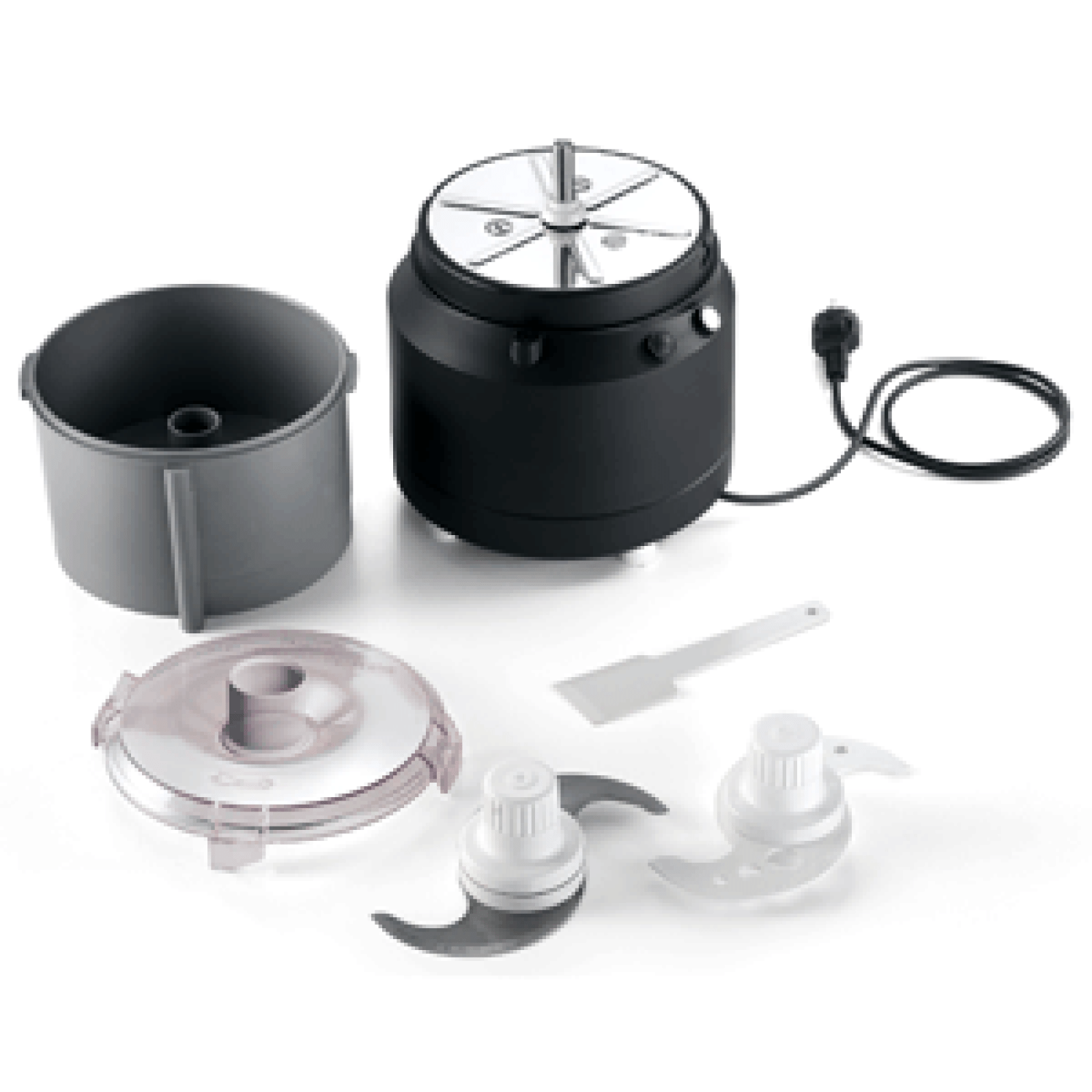 Підстава та чаша виконані з термостійкого пластику. Прозора кришка з полікарбонату має отвір для додавання інгредієнтів під час обробки. Кришка та бак взаємно заблоковані, але легко знімаються для операцій з очищення. Микровимикач для безпечної роботи.