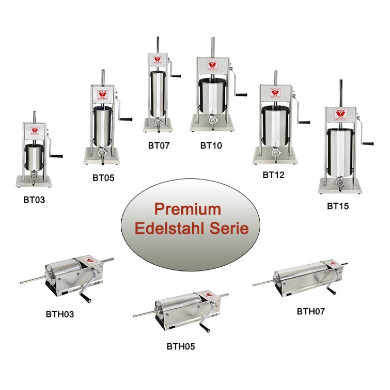 Наповнювачі для ковбас BT мають об'єм від 3 до 15 літрів та повністю виготовлені з високоякісної нержавіючої сталі.