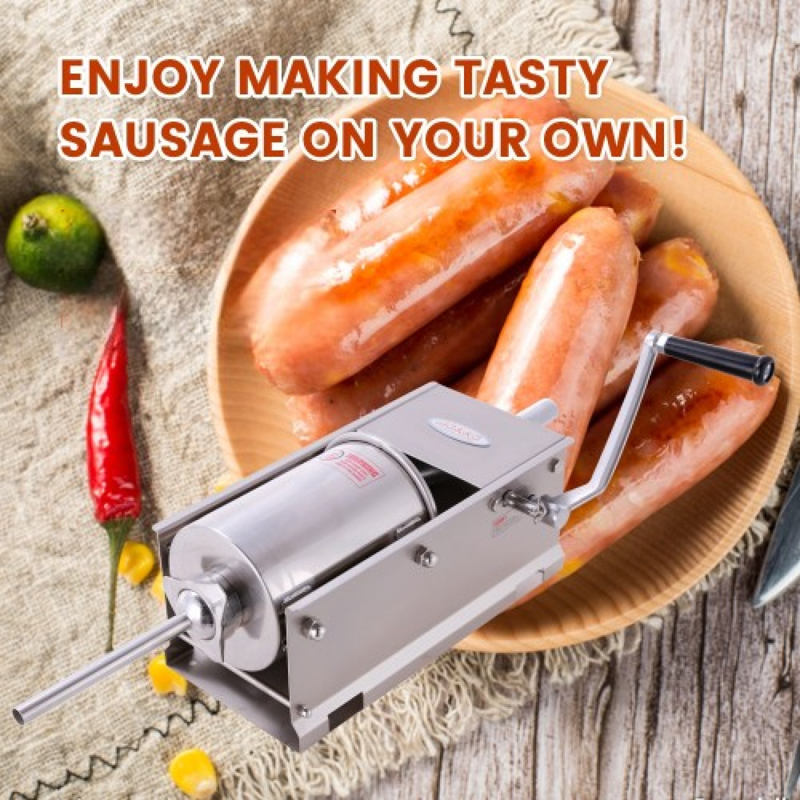 Усі компоненти із нержавіючої сталі. Ця ковбасна машина виготовлена з усіх компонентів з нержавіючої сталі, включаючи опорну плиту, циліндр, труби набивки і каністру. Поршень навіть має функцію випуску повітря для додаткової зручності. Це гарантує, що наповнювач для ковбас буде міцним та довговічним, а також витримає часте використання.