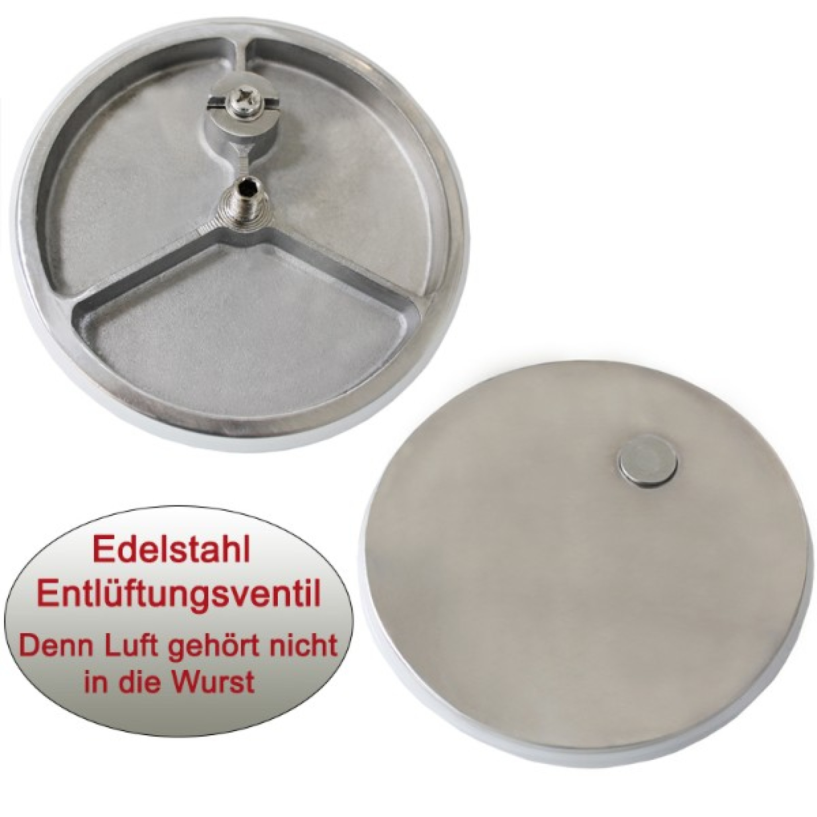 Ці наповнювачі для ковбас мають випускний клапан на верхній стороні плунжера, за допомогою якого можна випускати надлишки повітря з наповнювача. У притискній пластині плунжера є якісне силіконове ущільнення.