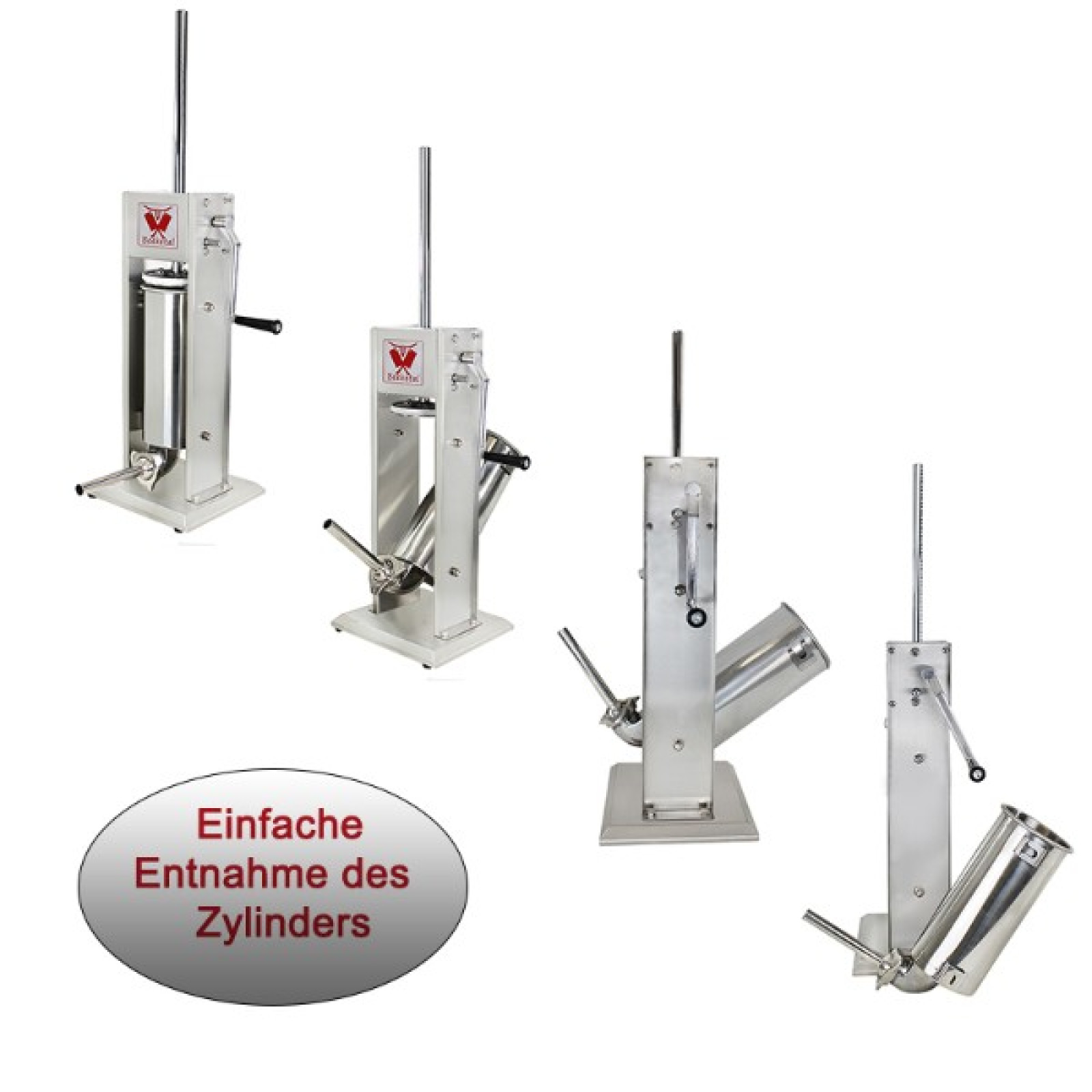 Для наповнення ковбасного шприца циліндр розблокується та знімається вбік (вертикальна модель) або вгору після розблокування (горизонтальна модель).