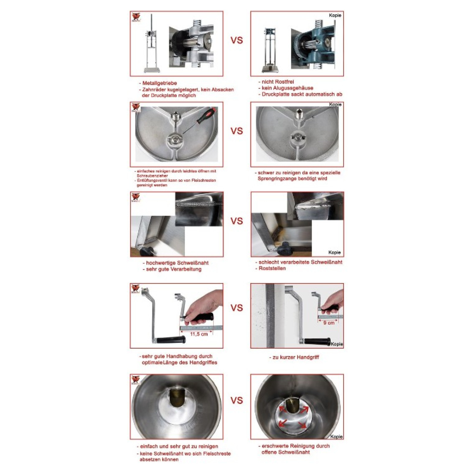 Ці наповнювачі для ковбас мають випускний клапан на верхній стороні плунжера, за допомогою якого можна випускати надлишки повітря з наповнювача. У притискній пластині плунжера є якісне силіконове ущільнення.