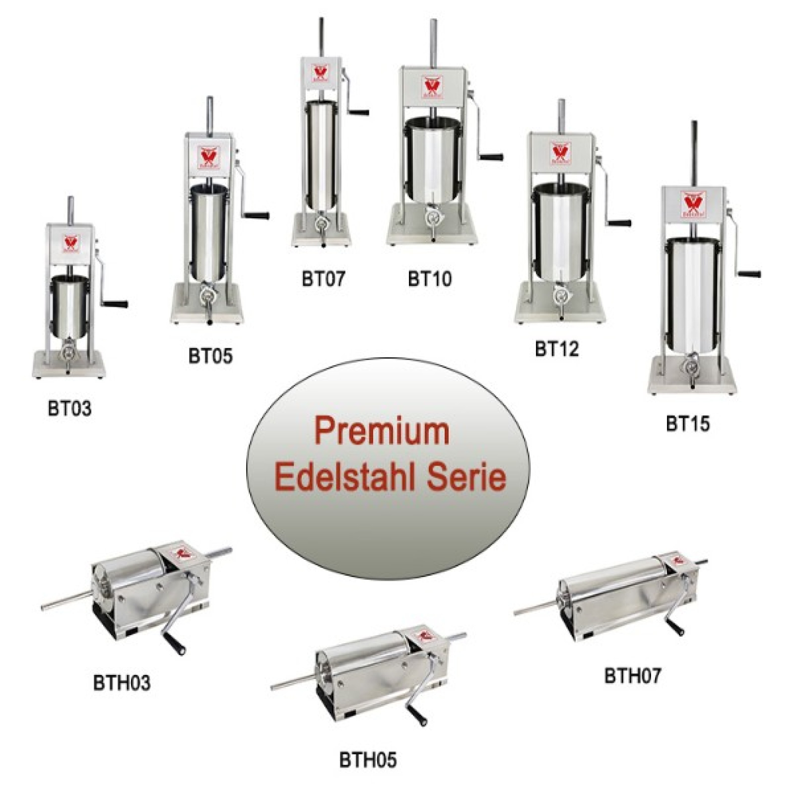 Наповнювачі для ковбас BT мають об'єм від 3 до 15 літрів та повністю виготовлені з високоякісної нержавіючої сталі.
