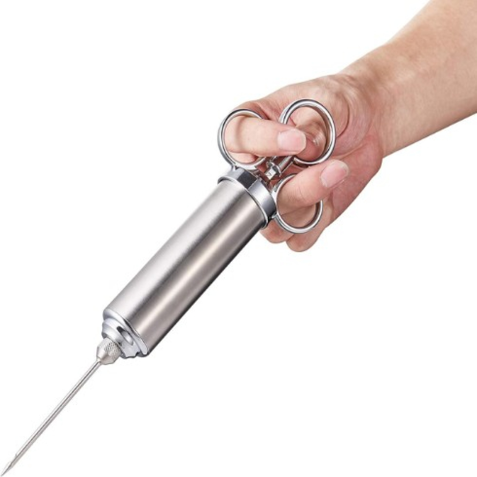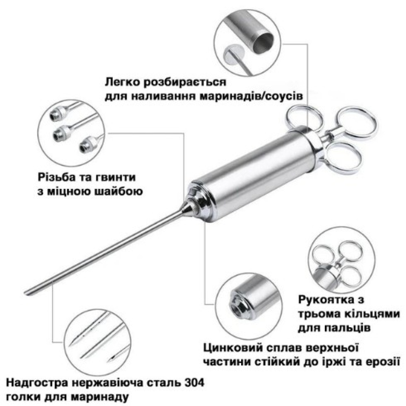 Рукоятка з трьома кільцями для пальців забезпечує краще захоплення і зручне використання. За допомогою такого кухонного шприца ви зможете надати вашим стравам унікального аромату і смаку, роблячи їх ще більш апетитними і соковитими. Будь то запечене м'ясо, смажена курка або мариновані реберця, кухонний шприц-ін'єктор допоможе вам досягти ідеального смаку.